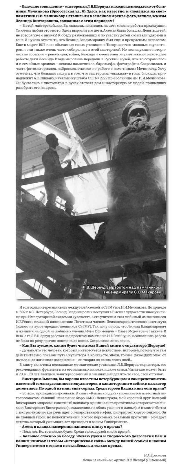 Наверно, Леонид Шервуд тоже имеет к Вам родственное отношение?Да, я его правнучка. Леонид Владимирович Шервуд – талантливый скульптор, автор памятников - адмиралу Макарову в Кронштадте, «Часовой», И.И.Мечникову и многих других. Его отец, мой прадед, Владимир Осипович Шервуд – архитектор Исторического музея на Красной площади в Москве. А брат Леонида Владимировича – Александр Владимирович Шервуд – автор Ласточкиного гнезда, одного из символов Крыма. Вообще история моих предков – отдельная тема, очень интересная. Выходцы из Англии, они много хорошего сделали для нашей страны. Недавно вышла монументальная прекрасно иллюстрированная книга